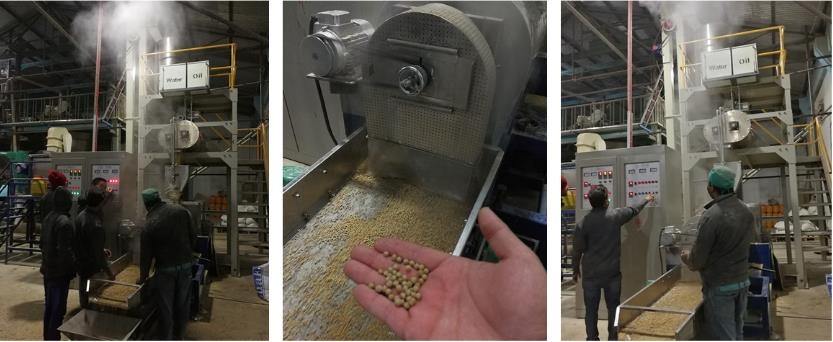 流程:粉料 → 膨化调质 → 螺杆膨化机 → 干燥/冷却 → 液体喷涂。